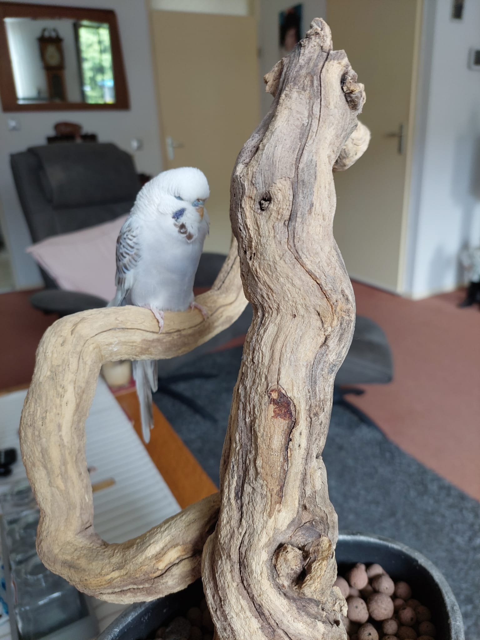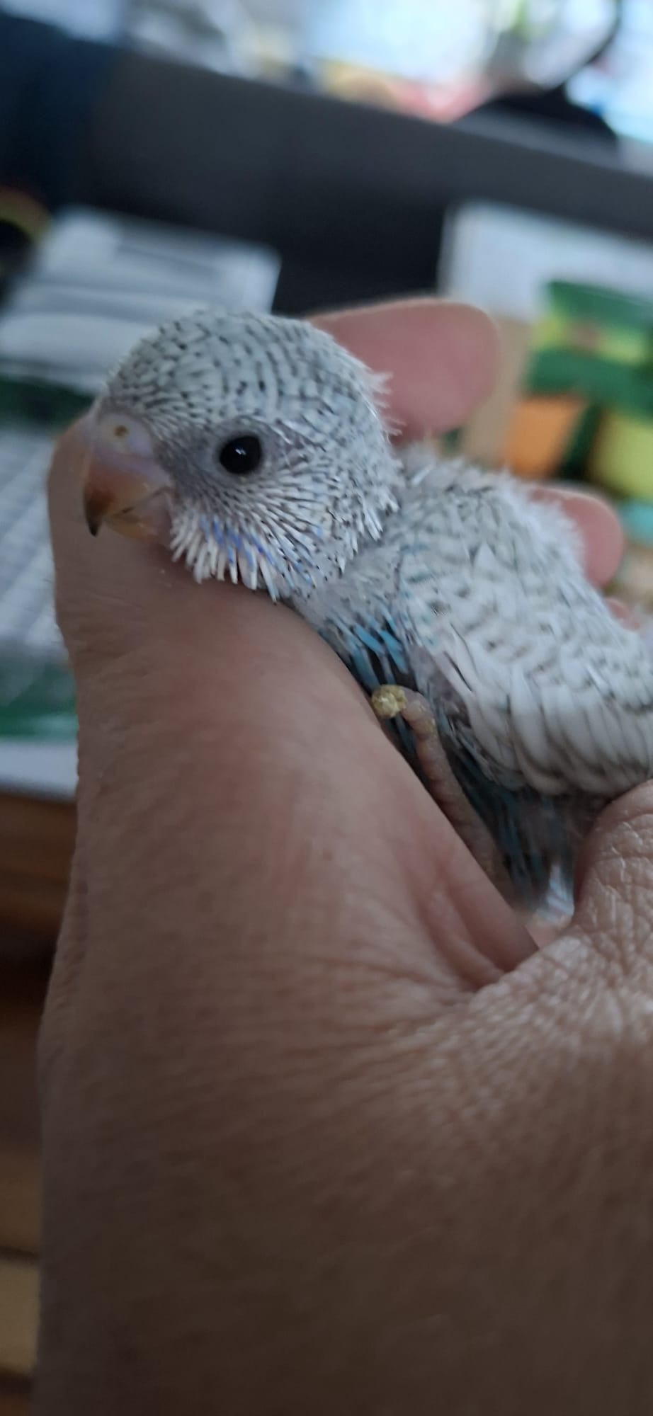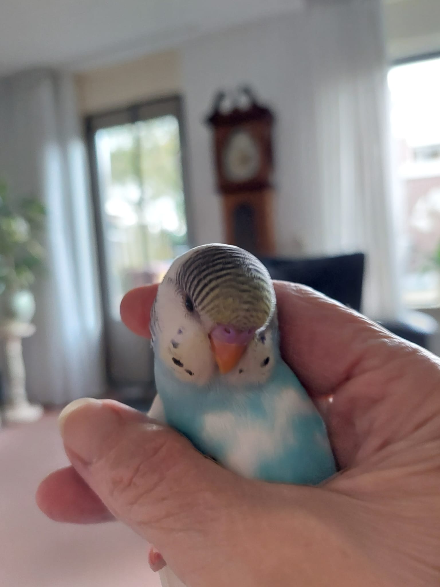 rechts. Van morgen hebben we hem op een grote stok gezet, en op de lamp en hij ging vanzelf vliegen heel hoog, ja wij alles dicht gedaan gordijnen spiegel afgedekt, haha dat hoefde helemaal niet, maar wij deden dat ook bij de parkietjes uit de winkel, en die vlogen wel een keer tegen de spiegel zo sneu, maar deze is harstikke hand tam, hij zat ook al op mijn hoofd haha, dus lieve vriendjes we zijn blij met hem, tevens dank aan die lieve fokker. Tot een anderen keer vriendjes