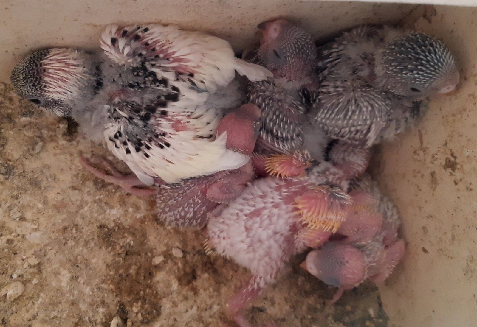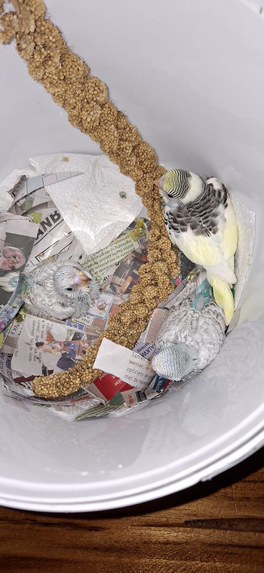 Ja hoor daar ben ik met een foto, en dat word drie parkietjes in een schaal met oude kranten
